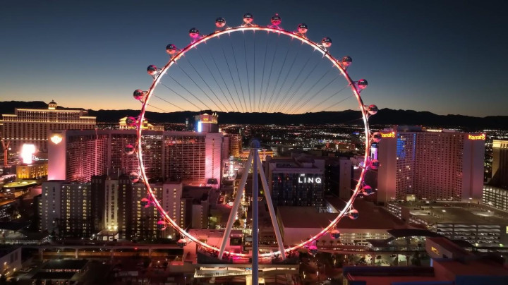 豪客摩天轮,位于好意思国内华达州拉斯维加斯的赌城通衢上,以充满戏剧性的饭铺、赌场和摩天大楼为布景,这座高167.6米的摩天轮,直径长158.5米,在2014年灵通时是全世界最高的摩天轮,直到2021年被取代。豪客摩天轮属于林尼克酒店悉数,有28个高技术玻璃密封舱,总容量为1120名乘客,运行一圈约莫需要30分钟,票价晚上比日间贵,毕竟醉死梦生的赌城夜景愈加劝诱东说念主。
