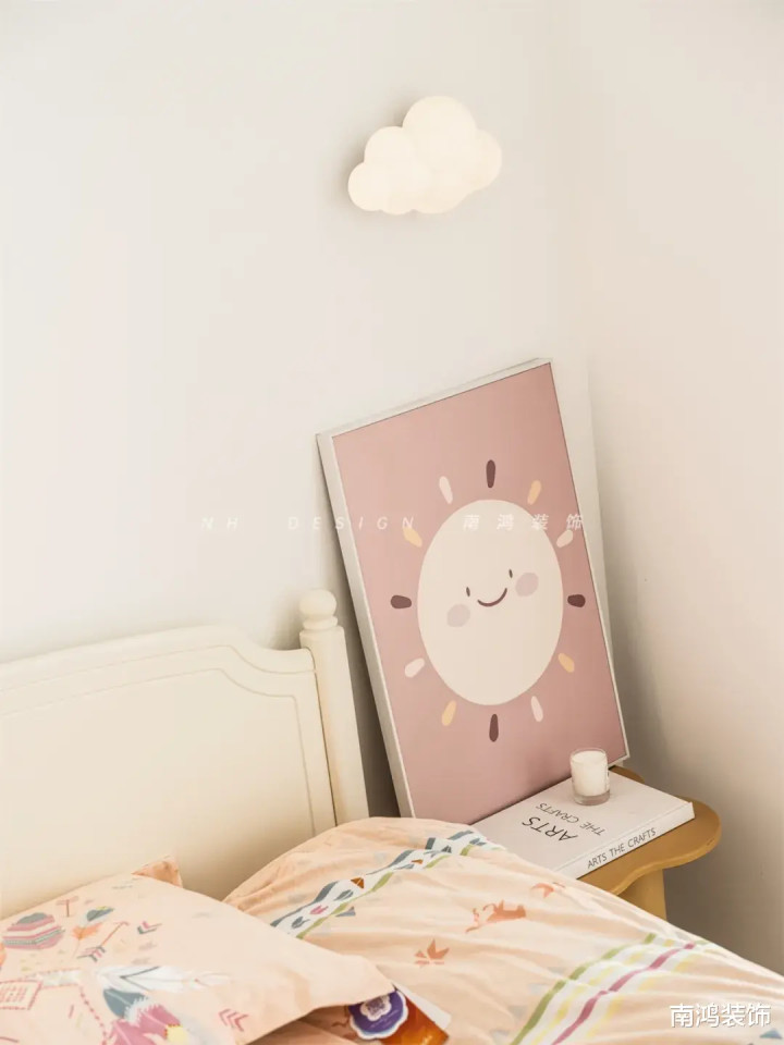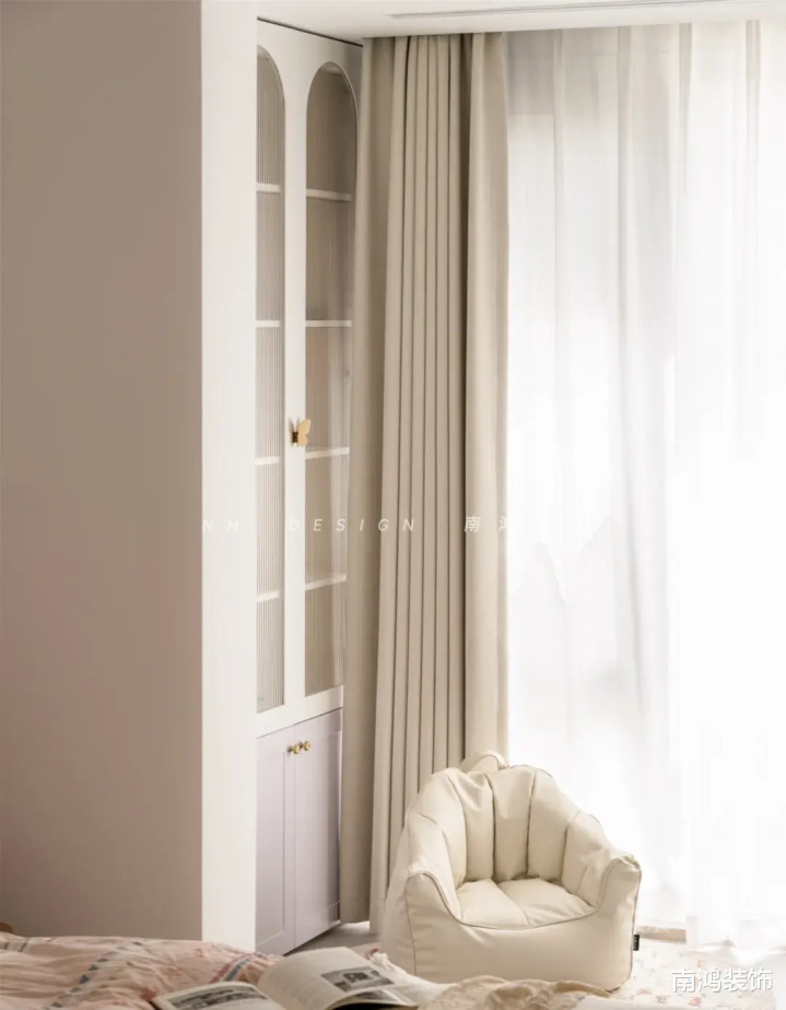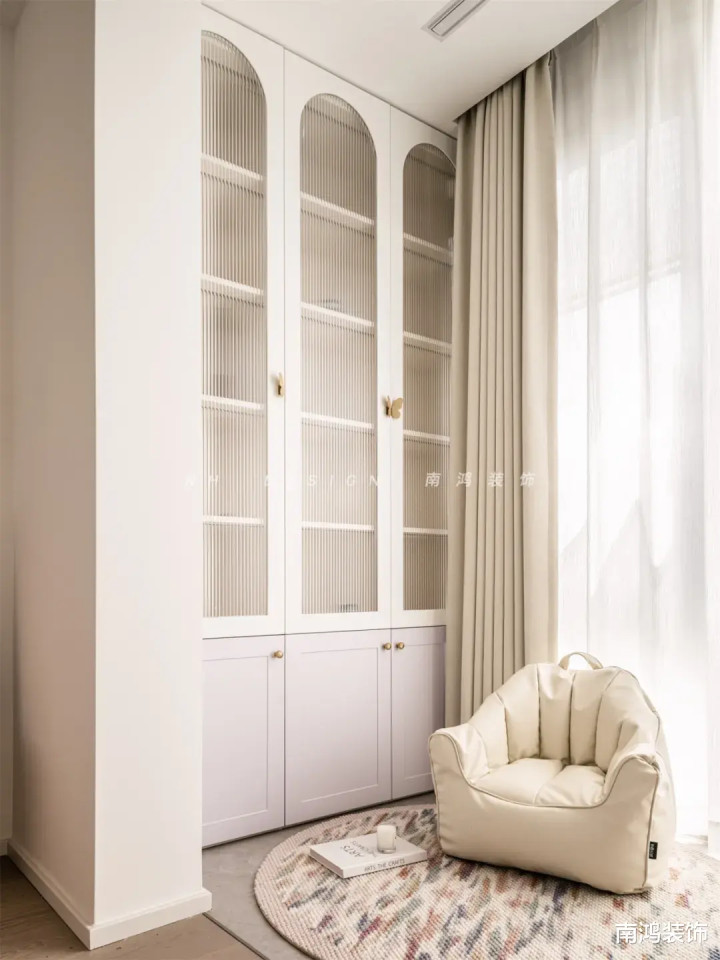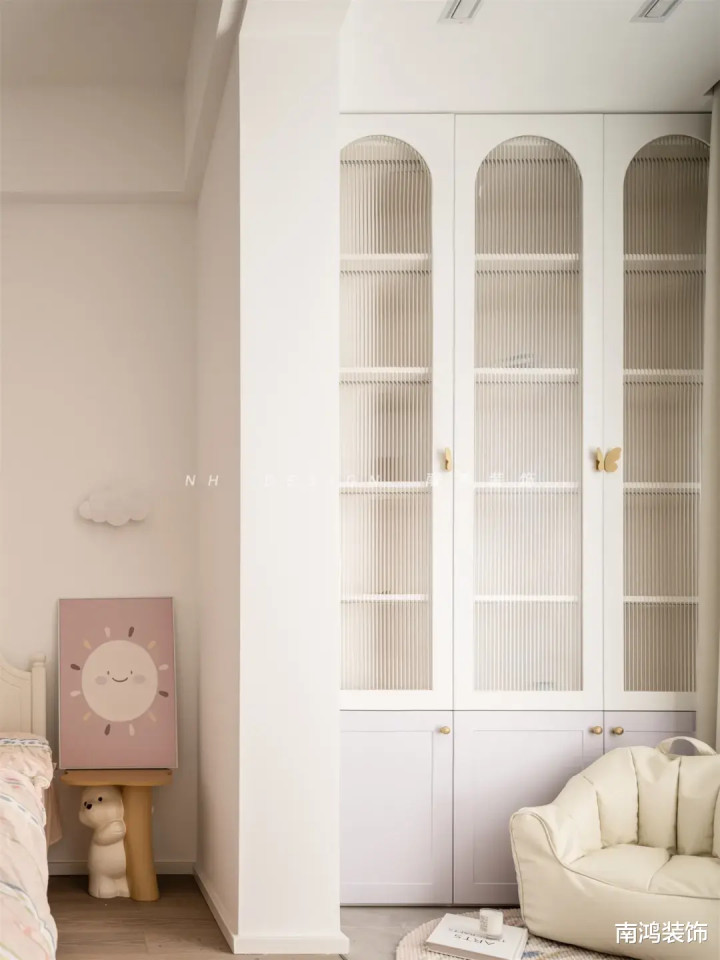 儿卧色调亮堂清浅,长虹玻璃材质的圆弧造型柜门上,有着金色的蝴蝶拉手,仿佛随时会振翅遨游,为孩子宽广注入童话般的奇妙思象力。