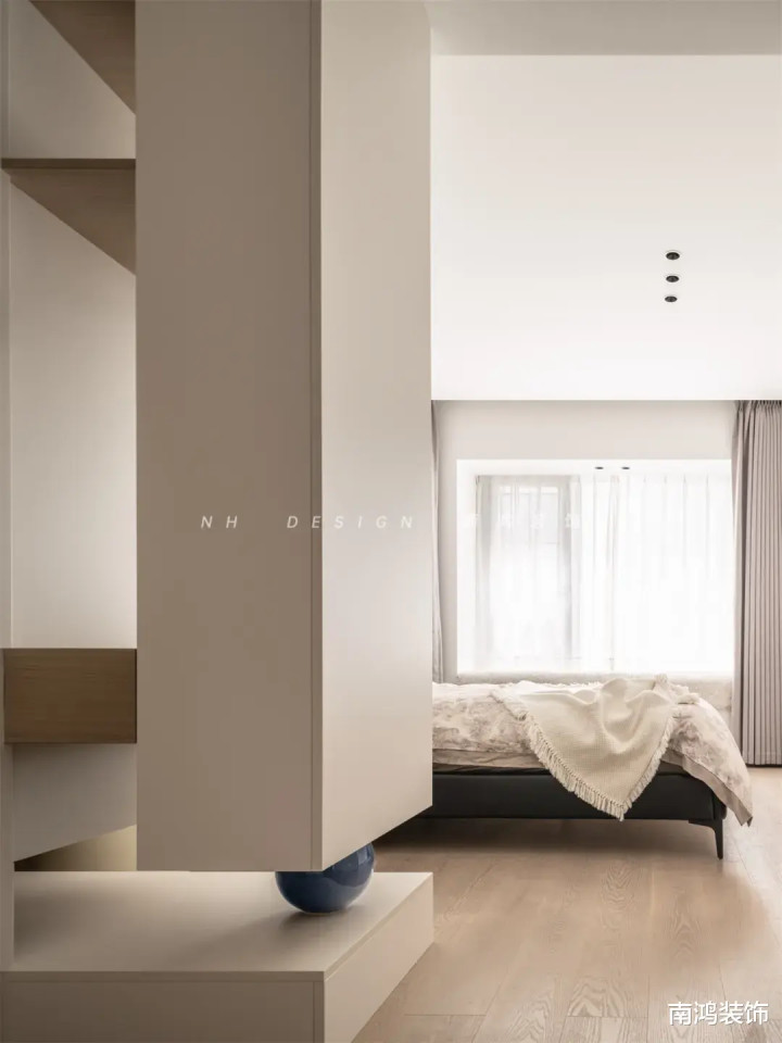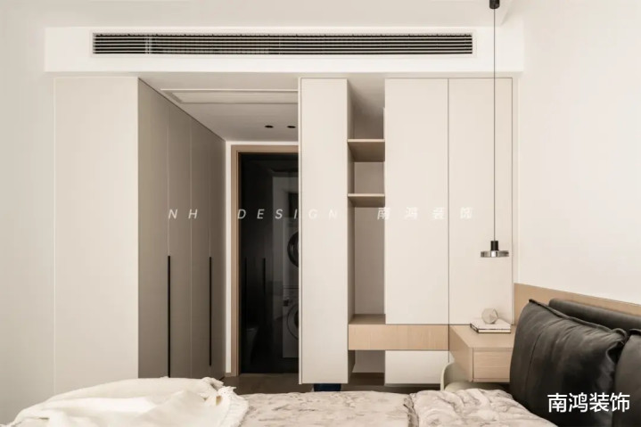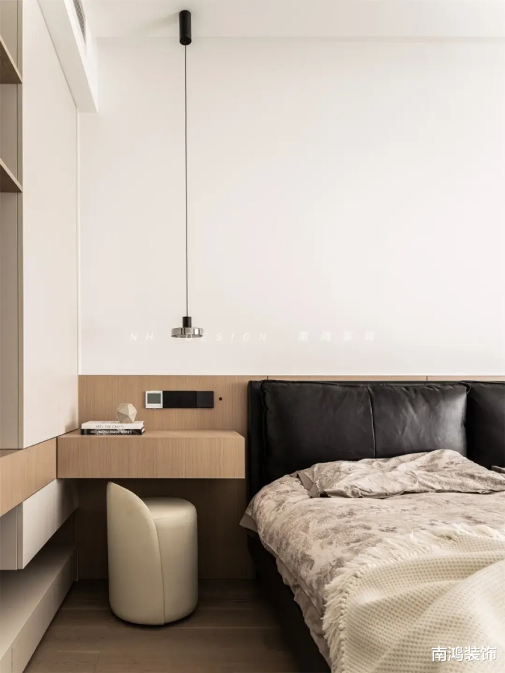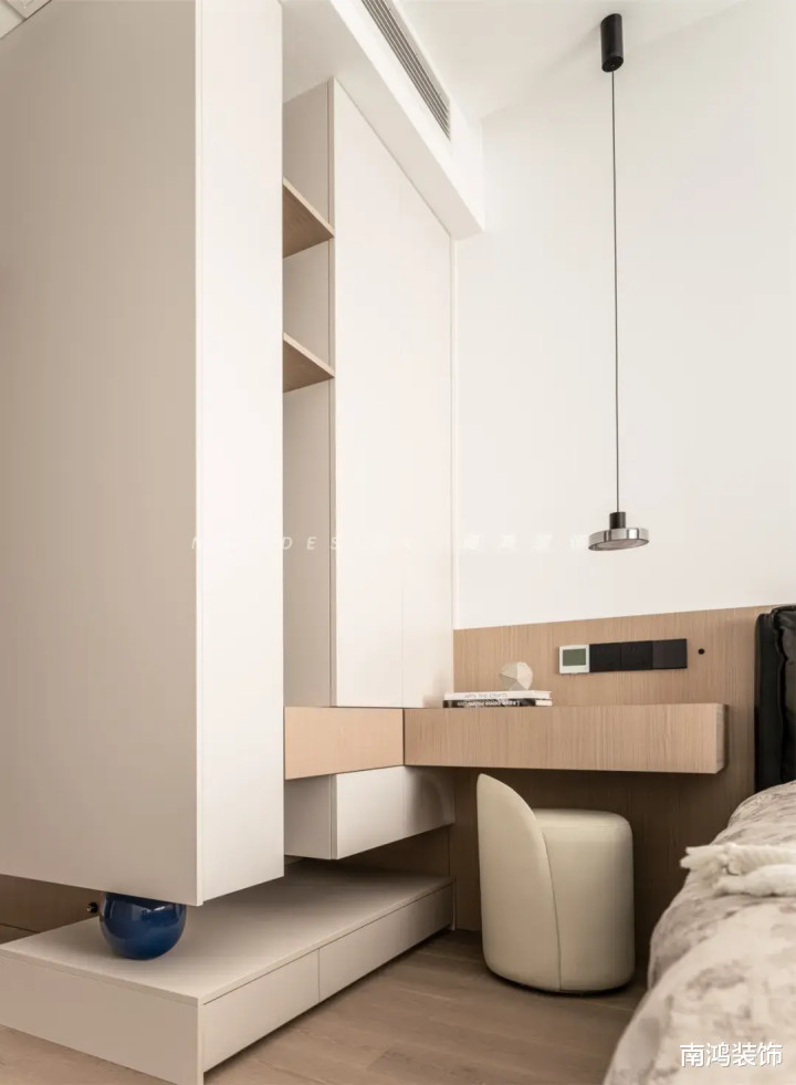 主卧有着极简框架下独属的克制、静谧氛围,床侧梳妆台当然地从柜体延迟而出,在颜色与结构上造成完整过渡,线条舒展而通达。