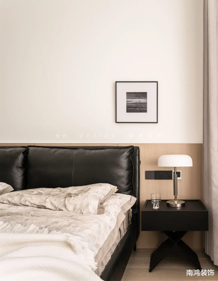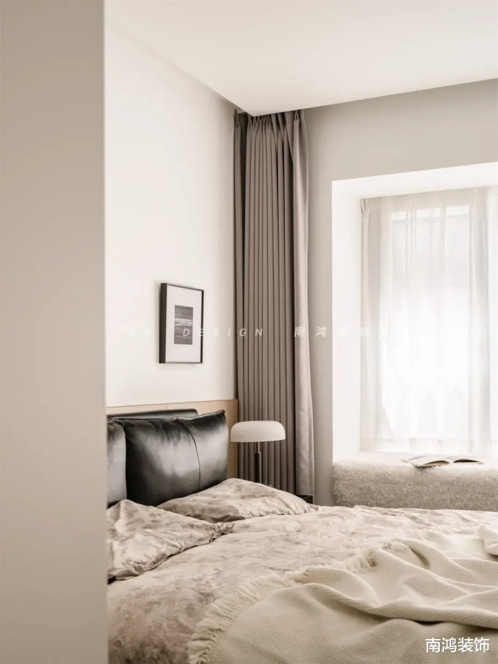 飘窗以优柔坐榻体式,成为日光漫入的容器,舒徐柔软的休憩情谊温存彭胀。留白的配景墙大开沉稳呼吸,木饰面半墙勾画空间档次,一张玄色皮艺床具介入,在颜色与肌理上造成较着碰撞,亦实现极妙的视觉均衡。
