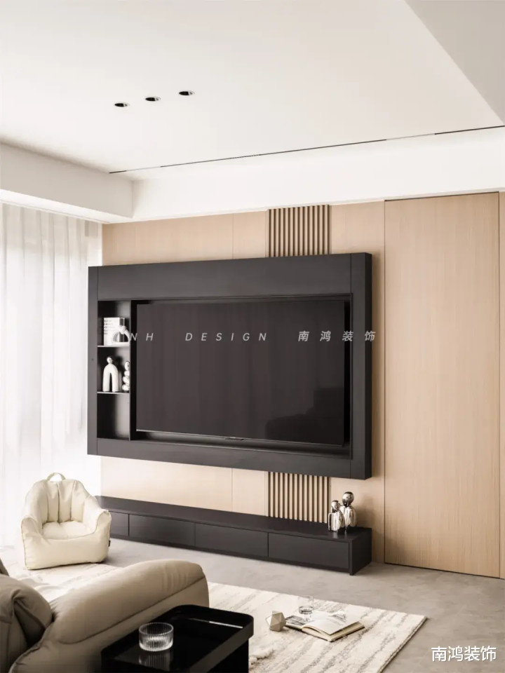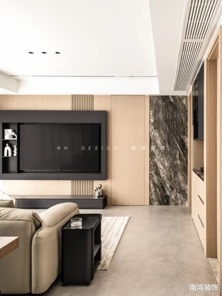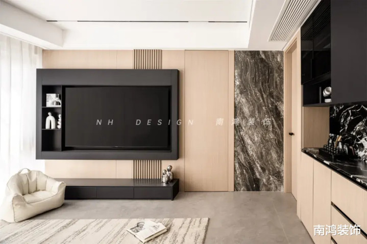 本案哄骗客餐一体的横厅样式,将大面当然光充分引入,视线通透怒放,有用缓解小户型的狭小。材质上主用关切木饰面搭配深色石材,冷暖均衡,贯穿性的立面将各个区域串联,形塑合股感。