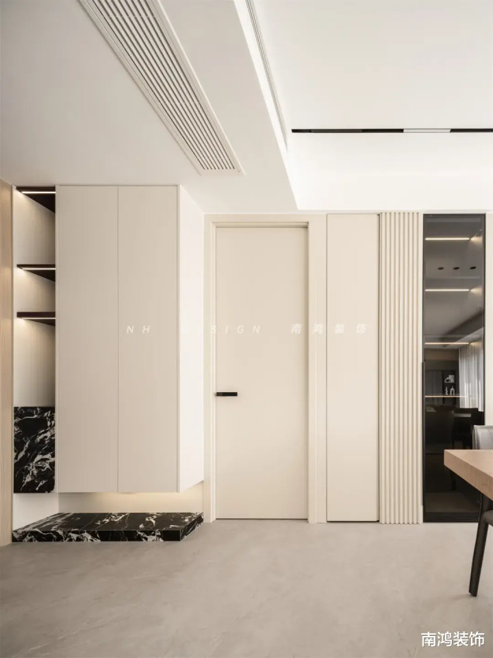 电视配景墙面右侧将次卧房门作念了隐形筹谋,与举座木饰面形影相随,组合纵向的格栅线条与深色石材,在谐和合股中拉开精真金不怕火有劲的档次,并赋予静态墙面以流动的节律感。