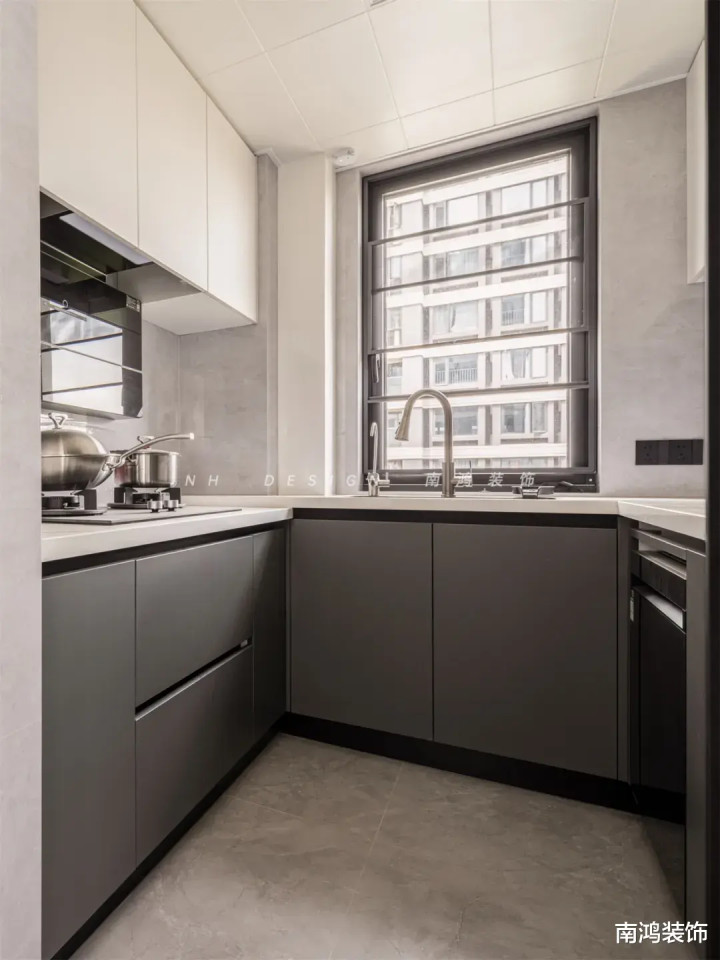 白色与灰色搭配的中厨空间,干净又千里稳。灶台区与水槽台造成所有高着落差,致密的圭臬考量,赐与使用者最大的下厨快意。